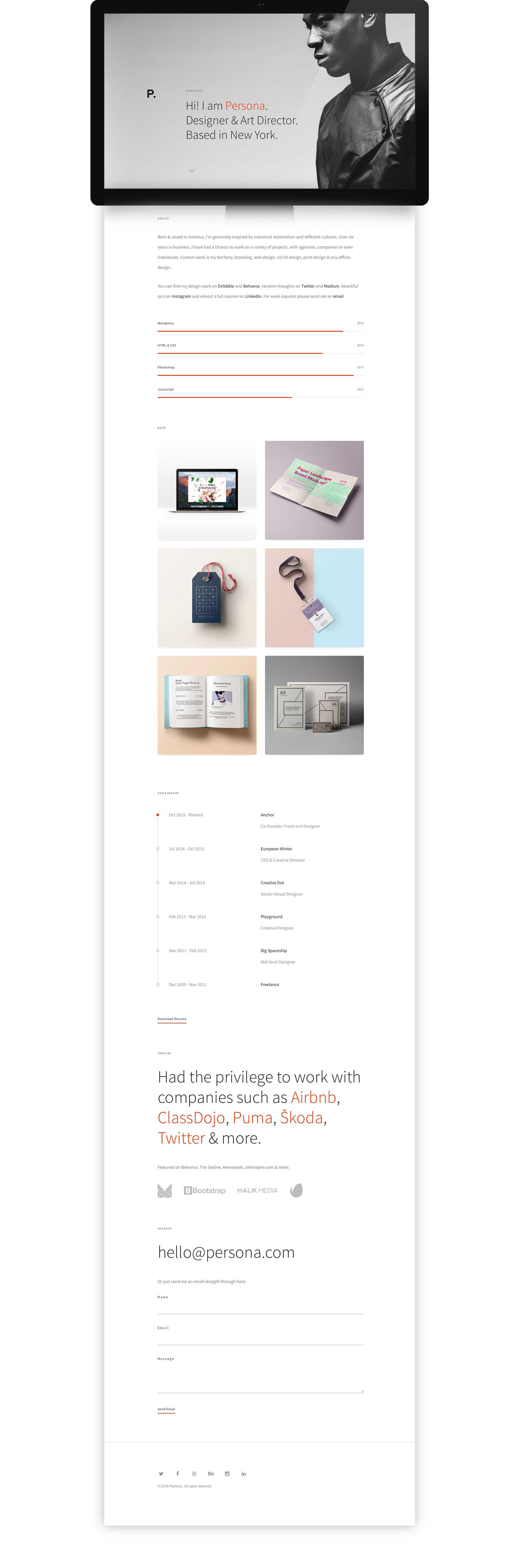 I wanted to make a compelling yet minimal design with this one. Bold elements and clever structuring combine well to create a feeling of an interactive printed resume.